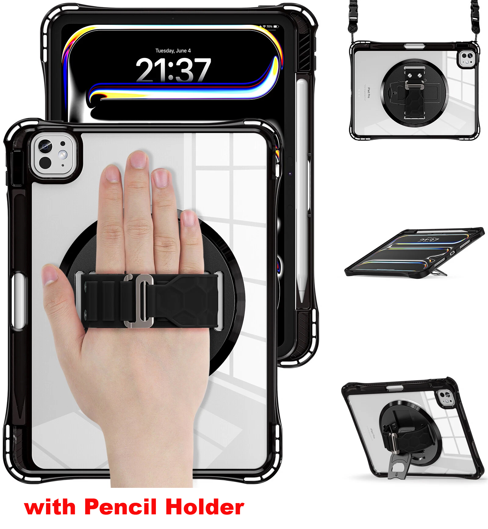 ITAC0H10P | Shockproof Rugged Armour Transparent Case with 360 Degree Rotation Kickstand, Hand Grip Strap, Body Sling & Pencil Holder (Available for iPad Mini 8.3, iPad 10.9, iPad 11, iPad 12.9 & iPad 13 inch)